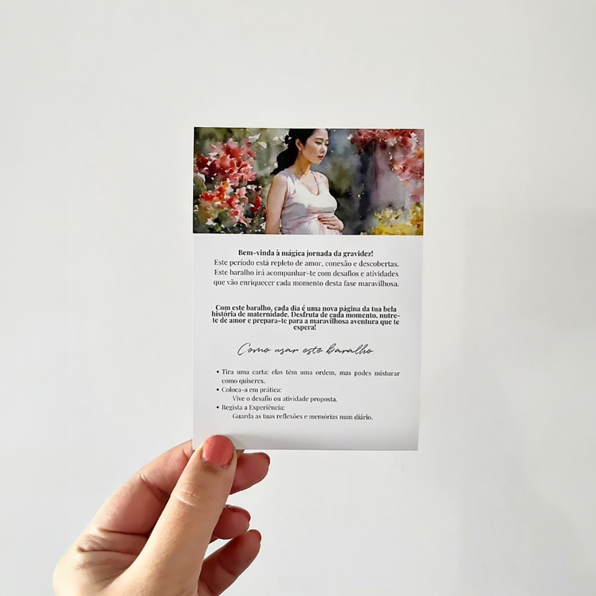 Cada carta é uma fonte de sabedoria e carinho, projectada para atender às necessidades únicas desta fase incrível, com temas que abrangem desde saúde e bem-estar físico e mental da mãe, até aos preparativos para o nascimento e cuidados com o recém-nascido.