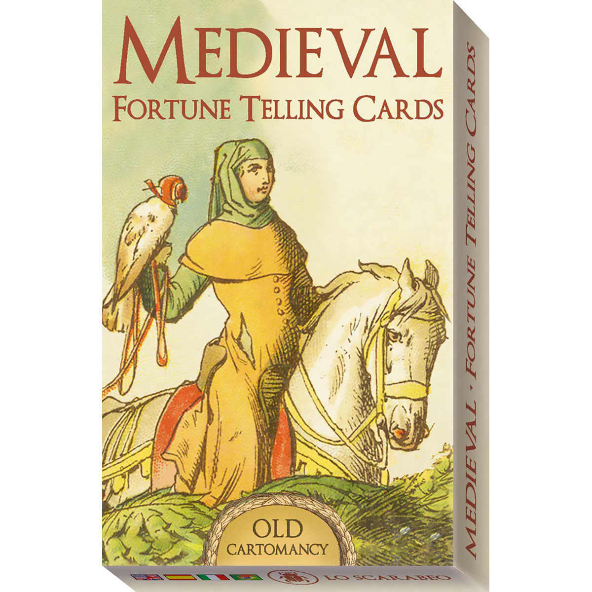 A playing card and fortune telling deck of old, illustrated with scenes of Medieval life. Each suit carries a different theme - romance, hunting, trade, war - to give a wider range of meanings and interpretations for fortune telling. It's the second deck in the Old Cartomancy line, originally from Southern Germany, XVIII century.